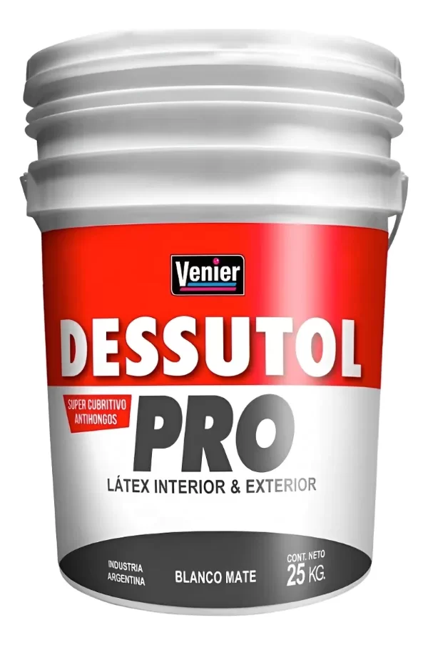 Látex Dessutol Interior/Exterior Mate es una pintura al látex desarrollada para proteger y decorar superficies de mampostería, maderas, fibrocemento, yeso, etc. Elaborada con polímeros acrílicos-estirénicos otorgándole cualidades especiales, se distingue por su alto poder cubritivo, su resistencia al frote húmedo, rápido secado y perfecta adherencia. La incorporación de biocidas de altísima calidad le otorga gran resistencia a los hongos.