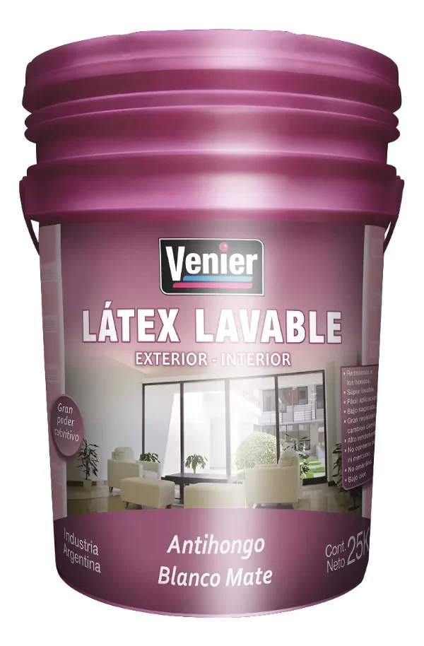 Látex Venier Interior / Exterior es una pintura al látex desarrollada para proteger y decorar superficies de mampostería, maderas, fibrocemento, yeso, etc. Elaborada con polímeros acrílicos-estirénicos, se distingue por su alto poder cubritivo, su resistencia al frote húmedo, rápido secado y perfecta adherencia. La incorporación de biocidas de alta calidad le otorga gran resistencia a los hongos. No amarillea. Se logran superficies más tersas con un mínimo esfuerzo. Se puede obtener una amplia gama de colores con el agregado de Entonador Universal Venier hasta un máximo de 30 c.c. por litro.