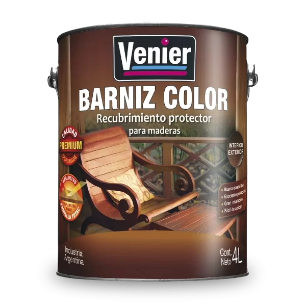 Barniz Color Venier es un revestimiento de alta gama destinado a proteger, embellecer y realzar el color de las maderas. Elaborado con resinas alquídicas de máxima calidad y con alto porcentaje de sólidos. Gracias a sus colorantes basados en ferrites transparentes y su exclusivo filtro solar celamínico Pantalla Total®, protege la madera de los rayos UV otorgándole gran resistencia a la intemperie y duplicando la vida útil del barniz. Es de muy fácil aplicación y gran nivelación.